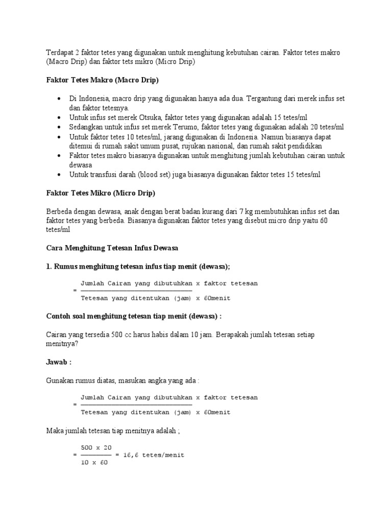 Jika Anda ingin mengetahui jumlah tetesan infus dalam detik maka dapat. Jumlah Cairan x 20 jumlah tetesan dlm menit x 60Misal. Hitung dosis ampul vial.